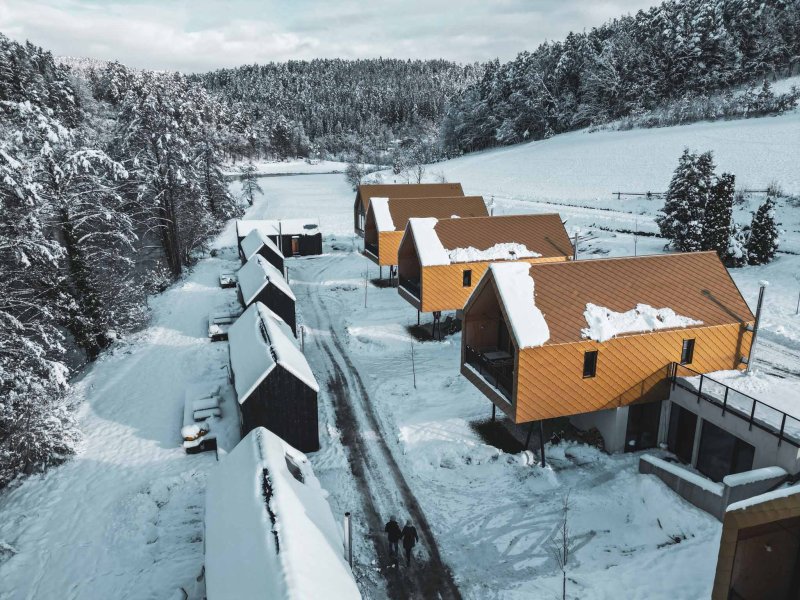 Die Lodge ist offen und organisch, eben 100% pures Abenteuer. Ideal für Freiheitsuchende, Familien und Freundeskreise. Drinnen Lärchenholzböden und hohe, lichtdurchflutete Räume. Davor ein Lärchenholz-Steg mit klarem Blick in den Sternenhimmel – überall viel Platz. Architektur und Natur ergänzen sich gegenseitig. Abends richtig klasse beleuchtet. Direkter Zugang über eine kleine Brücke zum EMOJI SPA Pavillon.